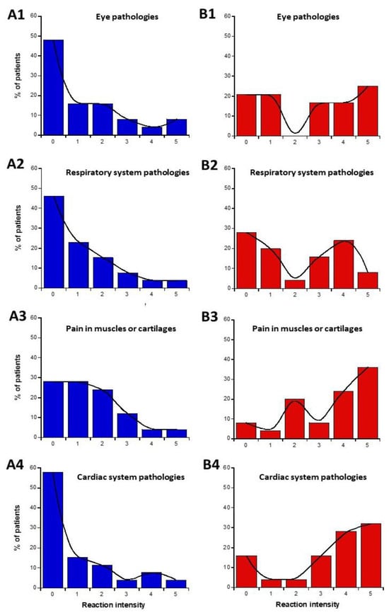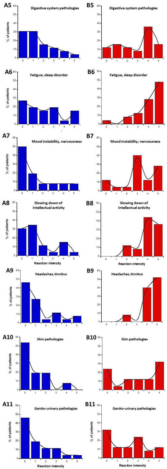 The data from parts C and D of the self-assessment questionnaire were plotted as intensities I-distribution histograms for all the organs and pathologies indicated: eye pathologies, pain in muscles and cartilages, cardiac system pathologies, digestive system pathologies, fatigue and sleep disorders, mood instability, and nervousness, slowing down of intellectual activity, headaches, and tinnitus, skin pathologies, genito-urinary pathologies (Figure 3). The replies to the C and D parts of the questionnaire were represented in blue and red (Figure 3A and Figure 3B, respectively).