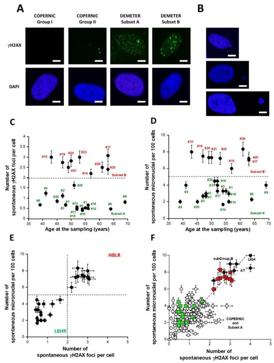 Interestingly, the subsets A and A’ and B and B’ were composed of the same DEMETER donors, respectively (Figure 4C,D). Indeed, when the number of spontaneous MN and the corresponding number of spontaneous γH2AX foci were plotted together, data revealed that A = A’ and B = B’. Furthermore, all the data obeyed a linear function linking the two endpoints y = 2.6x; r = 0.92 (Figure 4E). Such a mathematical link was found in agreement with published data [40].