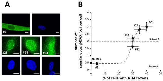 Recently, we have published 2 studies showing that permanent genotoxic stress or a low dose rate of gamma-irradiation progressively monomerizes the dimeric forms of the ATM protein that diffuse to the nucleus [42,43]. As a result, around the nucleus, the too-high local concentration of ATM monomers facilitates the redimerization of ATM, which triggers the formation of a perinuclear ATM crown. Such perinuclear ATM crowns have been shown to be a specific biomarker of the accelerated aging phenomenon [42,43]. Since the DEMETER fibroblasts associated with the HBLR phenotype elicited spectacular levels of spontaneous DNA breaks (Figure 4), we examined whether DEMETER fibroblasts cultured at high passages elicited perinuclear ATM crowns. For practical reasons, the ATM crowns assay was not applied to all 26 DEMETER cells but to 7 representative cell lines. Only the DEMETER fibroblasts of the subset B tested showed perinuclear ATM crowns at cell passages 30–40. The number of spontaneous γH2AX foci appeared to be a sigmoidal function of the percentage of the perinuclear ATM crowns (Figure 5). These findings suggested that the formation of perinuclear ATM crowns requires a threshold of more than 2 γH2AX foci per cell (Figure 5). Altogether, these data are consistent with the fact that the HBLR phenotype may be associated with accelerated aging [42,43].