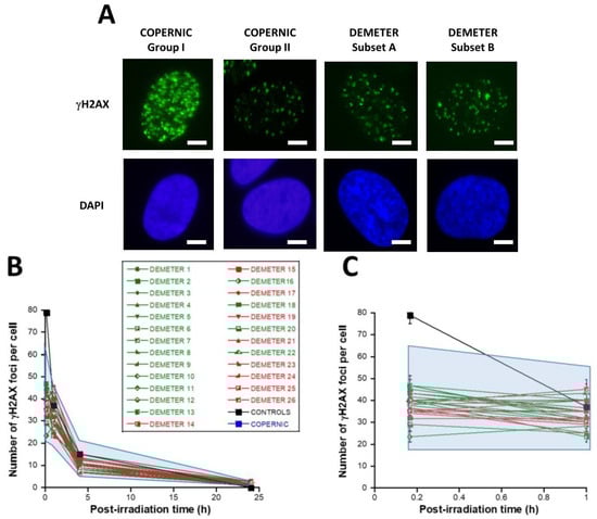 Kinetics of appearance/disappearance of γH2AX foci. (A) Representative immunofluorescence images of γH2AX foci after 2 Gy followed by 10 min post-irradiation. The white bar corresponds to 5 µm. (B) The number of γH2AX foci after 2 Gy X-rays followed by the indicated post-irradiation time (h) was plotted against post-irradiation time. Each plot represents the mean ± SEM of 3 replicates. The control and the subset A and B data were illustrated by black, green, and red symbols, respectively. The blue confidence zone summarizes where the COPERNIC data can be found. For each post-irradiation time, the control data are represented by the mean of the 11 pooled control cell lines data defined elsewhere [40,41]. (C) Panel (C) is a zoom over the first hour post-irradiation of panel (B).