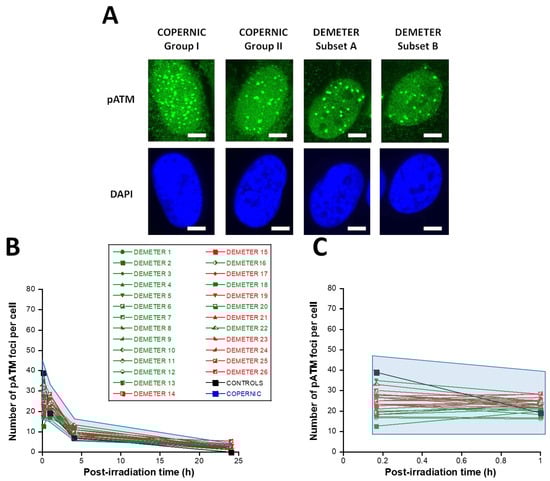 Kinetics of appearance/disappearance of pATM foci. (A) Representative immunofluorescence images of pATM foci after 2 Gy followed by 10 min post-irradiation. The white bar corresponds to 5 µm. (B) The number of pATM foci after 2 Gy X-rays followed by the indicated post-irradiation time (h) was plotted against post-irradiation time. Each plot represents the mean ± SEM of 3 replicates. The control and the subset A and B data were illustrated by black, green, and red symbols, respectively. The blue confidence zone summarizes where the COPERNIC data can be found. The control data are, for each post-irradiation time, the mean of the 11 pooled control cell lines data defined elsewhere [40,41]. (C) Panel (C) is a zoom over the first hour post-irradiation of panel B.