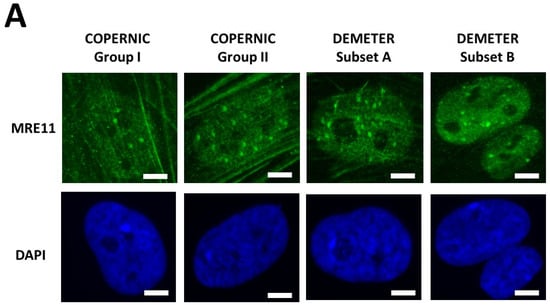 In the DEMETER fibroblasts, the number of γH2AX foci scored 10 min after 2 Gy was found on average, 2.05 lower than controls (p < 0.001) [23.33–46.66], suggesting an impairment of the DSB recognition step (Table 3) (Figure 6B,C). Interestingly, by calculating the average numbers of γH2AX foci scored 10 min after 2 Gy for each subset 1 and 2, it appeared that both values were not found different (p > 0.3). Conversely, the average numbers of γH2AX foci scored 10 min after 2 Gy of each for subset A and B were found significantly different (p < 0.05), suggesting that the phenotype HBLR is associated with the most impaired DSB recognition process (Table 3). By analyzing the number of γH2AX foci scored 24 h after 2 Gy, similar conclusions were reached: the average numbers of residual γH2AX foci of subsets 1 and 2 were not found different (p > 0.5) while those of subsets A and B were significantly different (p < 0.05), suggesting that the phenotype HBLR is also associated with an impaired DSB repair process when observed with anti-γH2AX immunofluorescence (Table 3; Figure 6).