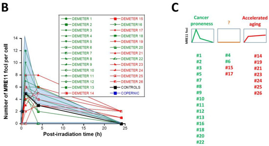In agreement with our previous publications, the radioresistant control fibroblasts from apparently healthy donors elicited a low number of MRE11 foci that increased from 1 h to 4 h post-irradiation, when the maximal number of MRE11 was reached and progressively decreased up to zero foci at 24 h post-irradiation [45] (Figure 8). From our previous data, three shapes of MRE11 foci kinetics have been observed: