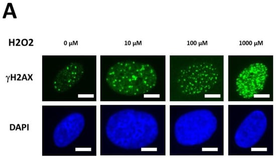 The kinetics of the MRE11 nuclease activity in the DEMETER fibroblasts raised the question of the management of both DNA single-strand breaks (SSB) and DSB. Indeed, the presence of SSB surrounding DSB sites may increase the severity of DSB through chromatin decondensation but also trigger the formation of highly damaged cells (HDC), which has been documented recently as a final step of perinuclear pATM crown [43]. Hence, to investigate further the molecular features of DEMETER fibroblasts, we treated cells with hydrogen peroxide (H2O2), a very documented SSB and DSB inducer [47]. Three H2O2 concentrations (10, 100, 1000 µM) have been applied to representative DEMETER cell lines for 30 min to induce SSB only, a mixture of SSB and DSB and DSB only, respectively [47]. The number of DSB per cell was assessed by anti-γH2AX immunofluorescence. Again, for practical reasons, the H2O2 assay was not applied to all the DEMETER cells but to 6 representative ones (Figure 9A).