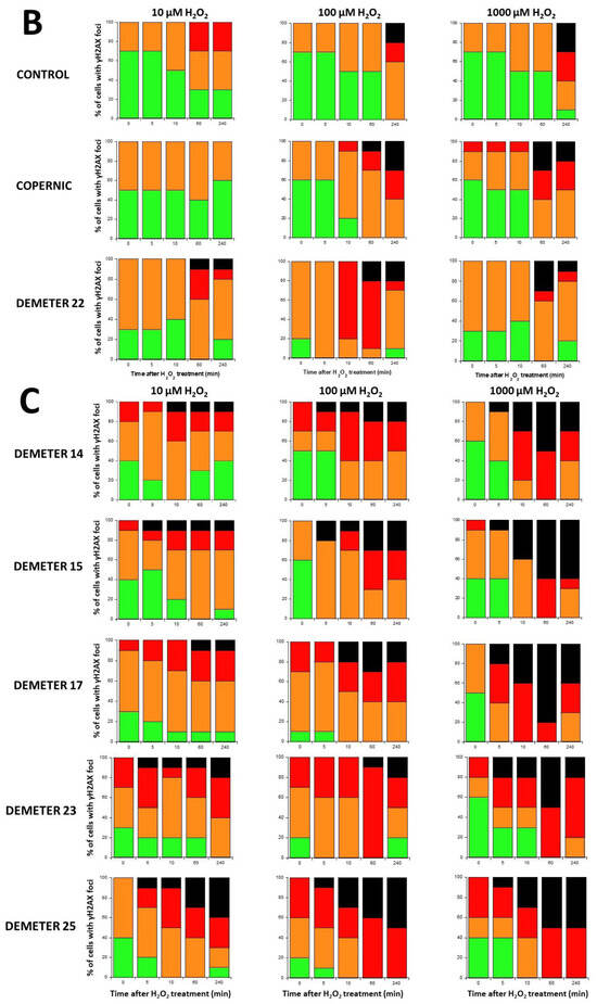 Four categories of cells were observed: cells without γH2AX foci (green), cells with 1–15 γH2AX foci (orange), and cells with 16–30 foci (red) and HDC (black). The radioresistant control cell lines showed a low amount of γH2AX foci and a slow progression towards the formation of HDC that were observed only after 240 min post-treatment for only 100 and 1000 µM H2O2 (Figure 9B,C). In COPERNIC cells, the formation of HDC began 60 min post-treatment. However, like controls, HDC appeared only at the two highest H2O2 concentrations (Figure 9B). Interestingly, the DEMETER 22 data (subset A) were found similar to the COPERNIC with the notable exception that some HDC appeared already at 60 min after 10 µM H2O2. By contrast, all the DEMETER cell lines belonging to the subset B tested (Figure 9B) elicited an early and abundant production of HDC suggesting that the high background observed spontaneously in these cells may help in the formation of HDC likely via a chromatin decondensation caused by the formation of numerous SSB. However, there was no presence of spontaneous HDC: 5 min post-treatment is required, at least, for the formation of HDC, suggesting that both SSB and DSB repair are required for initiating this process (Figure 9B). In order to better illustrate this molecular feature that would be specific to the subset B, the percentage of HDC assessed at 240 min post-treatment was plotted against the concentration of µM H2O2 (Table 6) (Figure 10).