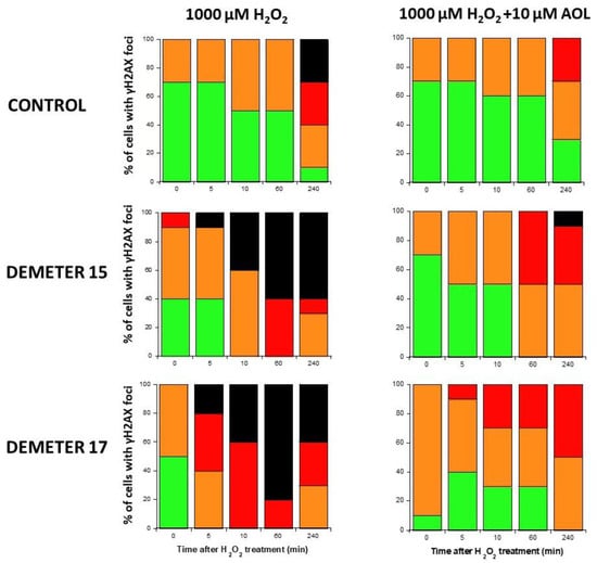 Histograms representing the percentage of cells with γH2AX foci as a function of the time after H2O2 treatment. The indicated final concentration of H2O2 was added directly to the cells for 30 min and a post-stress time was applied. A pre-treatment with 10 μM AOL has been applied to cells for 24 h before the H2O2 treatment when indicated. After anti-γH2AX immunofluorescence procedure, four categories of cells were observed: cells without γH2AX foci (green), cells with 1–15 γH2AX foci (orange), cells with 16–30 foci (red) and highly damaged cells (HDC) (black). Each percentage is the mean of two independent experiments, at least.