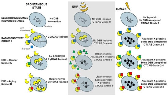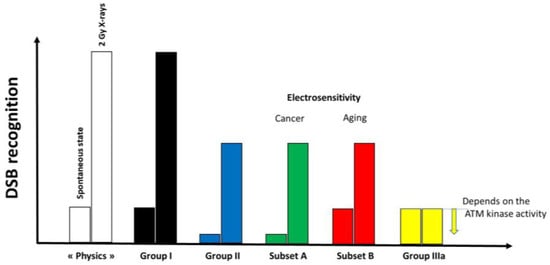 Electromagnetic hyper-sensitivity (EHS) and its causal link with radio-frequencies raise a major question of public health. In the frame of the clinical study DEMETER, 26 adult volunteers self-diagnosed as EHS-positive agreed to reply to a self-assessment questionnaire and to provide a skin biopsy sampling to establish a primary fibroblast cell line. The questionnaire and the biological data revealed, independently, 2 subsets of donors associated each with a low background, highly responsive (LBHR) and a high background, lowly responsive (HBLR) phenotype. A couple of subsets based on questionnaire data and based on the yield of spontaneous DNA double-strand breaks were found to be composed of the same donors at 64% identity. After exposure to X-rays, and application of anti-γH2AX, pATM, and MRE11 immunofluorescence, all the DEMETER fibroblasts (26/26) elicited a delayed radiation-induced ATM nucleoshuttling (RIANS). The use of RIANS biomarkers showed that the 2 phenotypes described above corresponded to DEMETER donors with a high risk of cancer (LBHR) or high risk of accelerated aging (HBLR). By exposing DEMETER cells to H2O2 followed by an antioxidative agent, we confirmed that EHS may be related to the management of DNA strand breaks. A preliminary molecular model of EHS inspired by the RIANS model was proposed.
