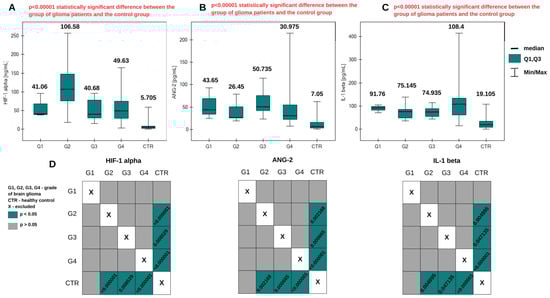 Graphs of changes in HIF-1α (A), ANG-2 (B), and IL-1β (C) concentrations in plasma samples from patients with brain gliomas of different grades. Information about the medians is placed above the box plots. (D) Dunn–Bonferroni POST-HOC graphical analysis. The green boxes with statistically significant values contain the p parameter values.