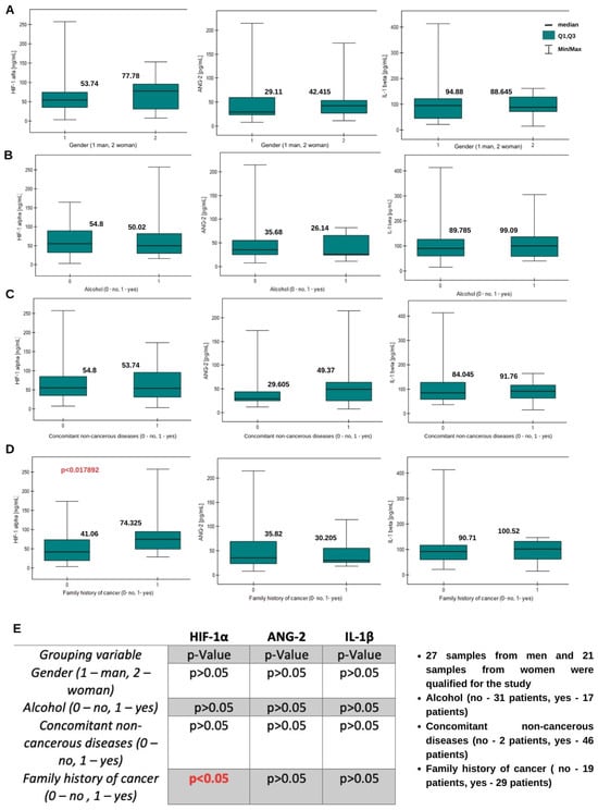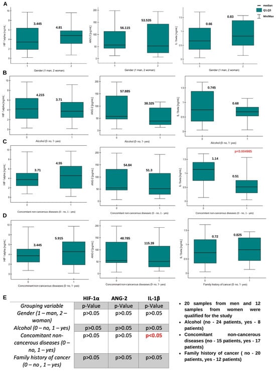 Graphs of the changes of HIF-1α, ANG-2, and IL-1β concentrations in plasma samples depending on (A) gender, (B) alcohol use, (C) concomitant non-cancerous diseases, and (D) family history of cancer. Information about the medians is placed above the box plots. (E) Mann–Whitney-U test p-value results table.