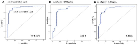 ROC curves for (A) HIF-1α; (B) ANG-2; and (C) IL-1β.