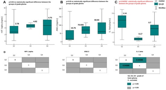 Graphs of changes in HIF-1α (A), ANG-2 (B), and IL-1β (C) concentrations in tissue homogenate samples from patients with brain glioma of different grades. Information about the medians is placed above the box plots. (D) Dunn–Bonferroni POST-HOC graphical analysis. The green boxes with statistically significant values contain the p parameter values.