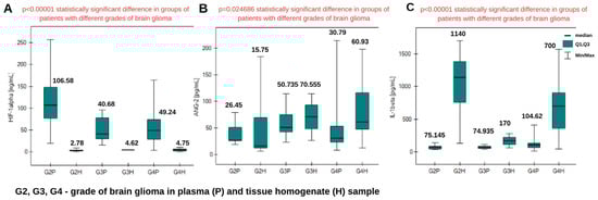 Graphs of changes in HIF-1α (A), ANG-2 (B), and IL-1β (C) concentrations in tissue homogenates and plasma samples from patients with brain glioma of different grades. Information about the medians is placed above the box plots.