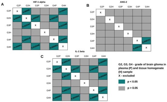 Post hoc Dunn–Bonferroni analysis was used to determine which specific groups had significant differences. The graphical analysis is presented in Figure 7. For the analysis, it was essential to compare the same glioma grade in different biological materials. For HIF-1α and IL-1β, significant differences occurred between plasma and tissue homogenate samples in grades G2 and G4. For ANG-2, statistically significant differences were observed only in grade G4. Comparing the concentrations, for HIF-1α, a higher concentration was obtained in plasma samples in each grade. In the case of ANG-2 and IL-1β, the average concentrations were higher in tissue homogenate samples.
