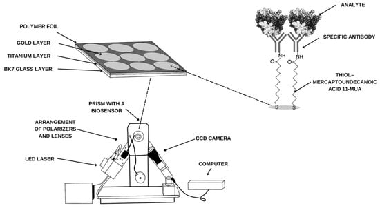 The research was carried out using the Surface Plasmon Resonance imaging (SPRi) equipment available at the Bioanalysis Laboratory, Faculty of Chemistry, University of Białystok. The structure of the analyzer and the layers produced on the surface of the biosensor are shown in Figure 8. The measurement system consists of polarizers and lenses through which the light emitted by an LED laser passes before falling on the prism with the biosensor. There, the light beam (wavelength λ = 635 nm) is reflected, and the light is collected by a CCD camera, where it is processed into an image. A quantitative signal is then obtained through mathematical operations.