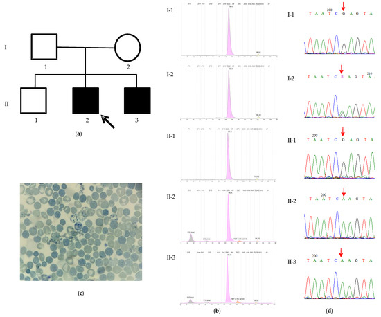 The characteristics of family 1. (a) The pedigree of the family and profiles of Hb electrophoresis. The proband (II-2) is indicated by the arrow. (b) The proband (II-2): HbA 79.9%, HbA2 1.6%, HbF 1.9%, HbH 15.7%, and Hb Bart’s 1.1%. The proband’s affected younger brother (II-3): HbA 81.4%, HbA2 1.5%, HbF 5.2%, HbH 10%, and Hb Bart’s 1.8%. The father (I-1): HbA 97.5%, HbA2 2.5%. The mother (I-2): HbA 97.6%, HbA2 2.4%. The proband’s healthy older brother (II-1): HbA 97.7%, HbA2 2.3%.; (c) A blood smear of the proband revealing HbH inclusion and Heinz bodies; and (d) Sanger sequencing chromatograms of the region spanning the ATRX: c.6392G>A variant (indicated by a red arrow) from the analyzed family members. The proband (II-2) and his affected brother (II-3) are hemizygous for the variant (A), whereas his unaffected father (I-1) and elder brother (II-1) are hemizygous for the reference sequence (G), and his mother (I-2) is heterozygous (G/A).