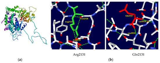ATRX protein 3D structure. (a) Native structure of ATRX protein generated by SWISS–MODEL server; (b) structure of wild-type Arg2131 and mutant type Gln2131. Substitution in codon 2131 eliminated hydrogen links with Asp2035 and Asn2130 and gained hydrogen links with Lys2036 and Leu2038.