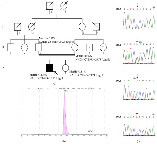 The methemoglobin levels were significantly elevated at 12.37% of total hemoglobin (normal value < 2%); the Hb electrophoresis was normal, with HbA and HbA2 levels within reference ranges (HbA: 97.8%, HbA2: 2.2%) (Figure 3a,b). The NADH-CYB5R3 activity was decreased at 15.55 UI/gHb (normal reference value > 19.19 UI/gHb). Neither the patient’s parents nor his healthy sister exhibited elevated methemoglobin levels or decreased NADH-CYB5R3 activity (Figure 3a). To further elucidate the cause of the patient’s condition, genetic testing was performed.