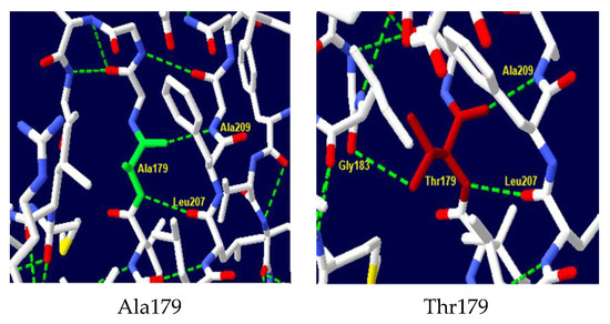 A comparative structural analysis of the wild-type and mutant protein using Swiss-PDB Viewer software v4.10 revealed significant alterations in the hydrogen bonding network within the protein’s active site (Figure 4). In the wild-type protein, the amino acid Ala179 forms critical hydrogen bonds with Leu207 and Ala209, stabilizing the protein’s tertiary structure and contributing to the formation of the active site. The substitution of Ala179 with Thr in the mutant protein disrupts these bonds and leads to the formation of a new hydrogen bond with Gly183, which can have significant functional consequences, including changes in protein stability, folding, and ligand binding affinity.