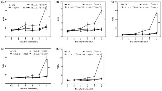 - Shu, C.; Wall, M.M.; Follett, P.A.; Sugimoto, N.; Bai, J.; Sun, X. Effect of Humidity-Triggered Controlled-Release 1-Methylcyclopropene (1-MCP) on Postharvest Quality of Papaya Fruit. Horticulturae 2023, 9, 1062. [Google Scholar] [CrossRef]