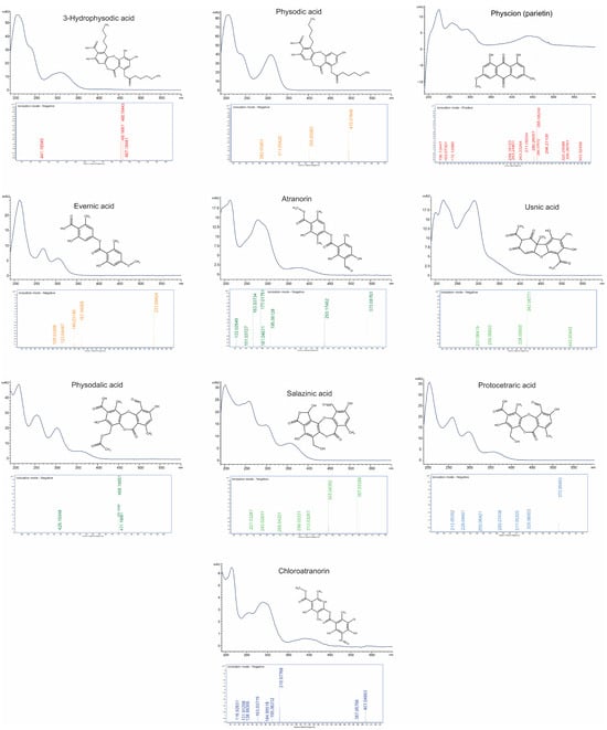 Three primary biosynthetic pathways of natural products in lichens can be distinguished: the shikimic acid pathway, the mevalonic acid pathway, and the acetate-polymalonate pathway. Among these, the acetate-polymalonate pathway plays a crucial role in the biosynthesis of the most common lichen acids. These metabolites include compounds based on phenolic structures composed of two or three orcinol or β-orcinol units []. This diverse group of natural products includes numerous compounds identified not only in H. physodes, but also in many other lichen species belonging to various families []. Using a developed and optimized CE method, acetone extracts from 28 lichen species were analyzed (Supplementary Table S2). In addition to the compounds previously identified in H. physodes, the method proved useful for the quantitative assessment of usnic acid, evernic acid, and physcion. A comparable approach was applied by Falk et al. [], who used MEKC to separate evernic acid, usnic acid, and atranorin in Cladina stellaris, confirming the suitability of this technique for lichen metabolite analysis. However, it should be noted that the simultaneous presence of evernic acid and atranorin in the same sample observed in E. prunastri may pose a challenge due to their similar migration times. To improve the resolution between these two compounds, a modified buffer composition was employed: 40 mM boric acid, 100 mM deoxycholic acid (DOC), and 12.5% methanol at pH 9.6. The identity of all metabolites (with the exception of chloroatranorin) was confirmed by comparing their migration times and UV-VIS spectra (190–600 nm, at least 95% of similarity) with those of standards obtained commercially or isolated via chromatographic methods. Furthermore, metabolite identities were validated using mass spectrometry (Figure 1).