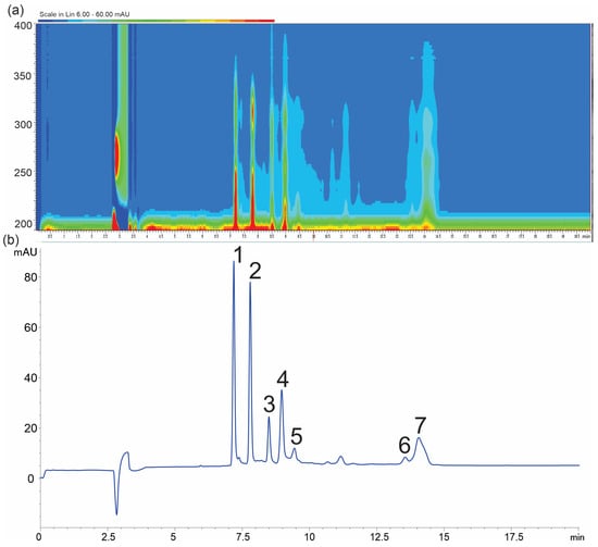 Electropherogram at 218 nm (a) and isoabsorbance plot of H. physodes extracts (b), (1) physodic acid, (2) 3-hydroxyphysodic acid, (3) atranorin, (4) physodalic acid, (5) chloroatranorin, (6) salazinic acid, and (7) protocetraric acid. Conditions: background electrolyte 60 mM boric acid, 70 mM deoxycholic acid concentration (DOC), and 14% MeOH at pH 9.6.