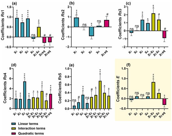 Regression coefficient plots of significant effects for the responses of (a) Rs1, (b) Rs2, (c) Rs3, (d) Rs4, (e) Rs5, and (f) overall separation efficiency (E). # p < 0.1; * p < 0.05; ** p < 0.01; *** p < 0.001; ns—not significant (p ≥ 0.1).