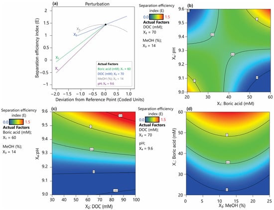 Piepel’s trace plot (a) and response surface plots showing the effect of buffer properties on the separation efficiency index (E): (b) pH and DOC, (c) pH and boric acid, and (d) boric acid and methanol.