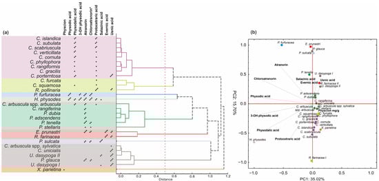 Chemotaxonomic relationships among lichen species based on secondary metabolite profiles. (a) Hierarchical cluster analysis (HCA) of species based on presence/absence of major lichen substances. (b) Principal component analysis (PCA) biplot showing distribution of species in relation to key natural products. Asterisks indicate approximate compound content: * ≤2 mg/g DW, ** = 2–10 mg/g DW, *** >10 mg/g DW. * The content of chloroatranorin was expressed as a relative quantity.