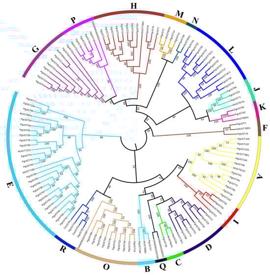 We conducted phylogenetic tree analysis by combining the PgUGTs with 18 A. thaliana UGTs, 4 Z. mays UGTs, and 2 C. sinensis UGTs, and thus classified the 107 PgUGTs into 17 groups (Figure 1). Bootstrap values for the corresponding nodes are all greater than 95 with high confidence. Phylogenetic analysis showed that these seventeen groups were groups A-N already identified in A. thaliana, groups O and P in Z. mays, and group R in C. sinensis, and that there was no PgUGT in group Q. Twelve UGTs in ginseng were selected by Khorolragchaa et al. as the most probable candidates for the synthesis of triterpenoids, belonging to six groups (A, E, G, L, N, and O) []. Most of the PgUGTs were also clustered in groups E (24), A (11), H (11), L (10), O (10), and G (9). This suggests that most of PgUGTs were also likely to be associated with the synthesis of triterpenoids.