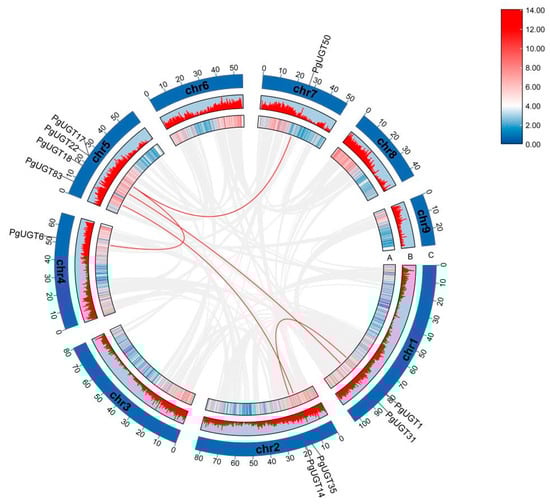 The duplicated event is a collinearity block in the P. grandiflorus genome, and the segmental duplication of PgUGTs are drawn with red lines. (A) Line colours indicate gene density. (B) The red line represents gene density. (C) Chr1-Chr9 represents the 9 chromosomes of P. grandiflorus.