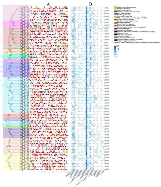 Analysis of cis-regulatory elements in PgUGT promoters. (A) Cis-acting elements of 2 kb promoter regions of PgUGT genes. (B) Heatmap analysis of Cis-regulatory elements of 2 kb promoter regions of PgUGT genes.
