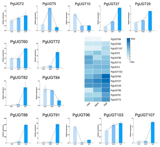 Expression of 14 PgUGTs genes in roots, stems, and leaves. The heatmap in the middle shows the expression pattern of 14 PgUGTs in root, stem, and leaf.