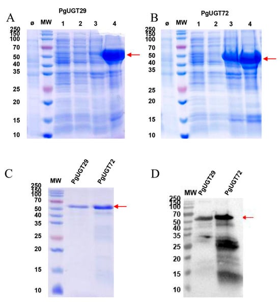 SDS-PAGE and Western blot analysis of the recombinant protein. MW: protein molecular weight standards; Ø: uninduced strains. (A) SDS-PAGE analysis. Line 4: crude extract of PgUGT29. (B) SDS-PAGE analysis. Line 4: crude extract of PgUGT72. (C) SDS-PAGE analysis of purified PgUGT29 and PgUGT72 protein. (D) Western blot analysis of purified PgUGT29 and PgUGT72 protein.