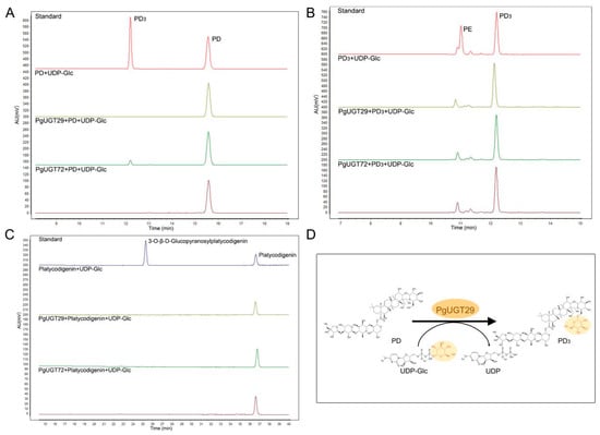 To further determine the functions of PgUGT29 and PgUGT72, we took HPLC measurements of the enzyme reaction products (Figure 6). The results show that PgUGT29 could catalyse the combination of PD and Glc to produce PD3 when PD was the substrate and UDP-Glc was the donor, whereas PgUGT72 did not have the same function (Figure 6A). Neither PgUGT29 nor PgUGT72 could catalyse the generation of PE from PD3 when PD3 was used as a substrate and UDP-Glc as a donor (Figure 6B). Neither PgUGT29 nor PgUGT72 could catalyse the generation of 3-O-β-D-Glucopyranosylplatycodigenin from platycodigenin when UDP-Glc was the substrate and UDP-Glc was the donor (Figure 6C).