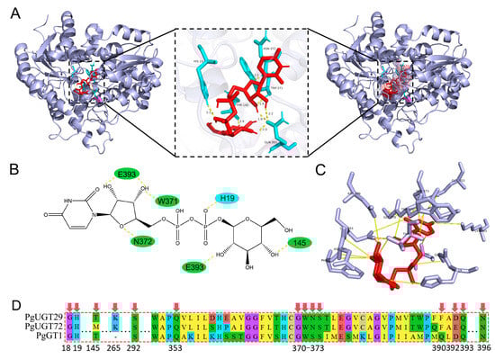 In order to clarify the molecular basis for the binding of PgGT29 and UDP-Glc, molecular docking of PgGT29 and UDP-Glc was performed to identify crucial amino acid residues. In general, we consider that the docking results are feasible for binding energies less than −1.2 kcal/mol or less than −5 kj/mol. The lowest energy conformational binding energy of UDP-Glc and PgUGT29 was −6.25 kcal/mol, which indicates that our docking results are stable and reliable. As shown in Figure 7A, UDP-Glc was completely encapsulated by PgUGT29 in a narrow channel. There, UDP-Glc interacts with the PSPG motif at the C-terminus of PgUGT29 (Figure 7A,B). The docking results show that a total of seven hydrogen bonds were generated between UDP-Glc and PgUGT29, including five hydrogen bonds formed between UDP-Glc and amino acids on the PSPG motif. W371 forms a hydrogen bond with a hydroxyl oxygen atom close to the phosphate residue on a ribose, and N372 forms a hydrogen bond with an oxygen atom on the backbone of the ribose. Q393 can form a hydrogen bond with the two hydroxyl hydrogen atoms on the ribose and with a hydroxyl hydrogen atom at the C2 position of glucose, respectively. In addition, H19 can form a hydrogen bond with an oxygen atom close to the phosphate residue of glucose, and T145 can form a hydrogen bond with the hydroxyl hydrogen atom at the C4 position of glucose. It has been shown that UGTs recognise and bind UDP-glycosyl via the C-terminal PSPG motif, whereas the N-terminal structural domains are loosely bound to glycosides, which can lead to a diversity of substrate structures. This implies that PgUGT29 may bind the glucose portion of UDP-Glc by recognition of Q393 in the PSPG motif. PgUGT29, PgUGT72, and PgGT1 were aligned in multiple sequence comparisons to find the PSPG motif.