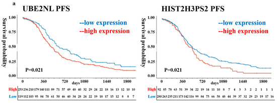 We next asked whether the expression of UBE2NL and HIST2H3PS2 also affected clinical outcomes in endometrial cancer (EC) patients. Using TCGA survival data for EC, we found that high expression of HIST2H3PS2 was significantly associated with poorer PFS and OS in all-stage EC patients based on log-rank tests. Specifically, the high-expression group had markedly reduced survival compared to the low-expression group (Figure 2a,b). In contrast, UBE2NL expression levels did not affect survival outcomes in EC patients.