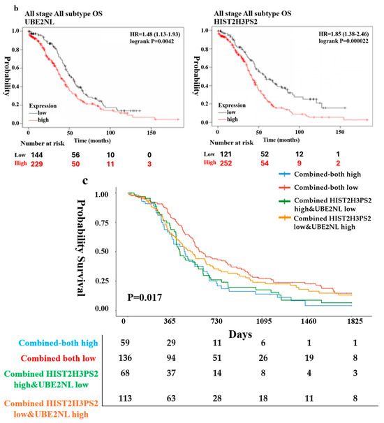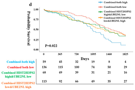 Further validation was conducted using Kaplan–Meier survival analysis on TCGA datasets for all subtypes and stages of ovarian cancer. High expression levels of UBE2NL and HIST2H3PS2 were significantly associated with poorer PFS and overall survival (OS) compared to the low-expression groups. Specifically, hazard ratios for OS in all-stage EOC patients were 1.48 (95% CI: 1.13–1.93) for UBE2NL and 1.85 (95% CI: 1.38–2.46) for HIST2H3PS2 (Figure 1a,b). When both genes of UBE2NL and HIST2H3PS2 were considered, progression-free survival and overall survival were better in patients with low expressions of both genes than in those with high expressions (p = 0.017 for PFS, p = 0.022 for OS) (Figure 1c,d).