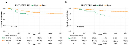 Progression-free survival (PFS) and overall survival (OS) based on HIST2H3PS2 expression in endometrial cancer (EC) patients. Kaplan–Meier survival analysis using TCGA data shows that EC patients with low HIST2H3PS2 expression had significantly better PFS (a) and OS (b) across all clinical stages than those with high HIST2H3PS2 expression.