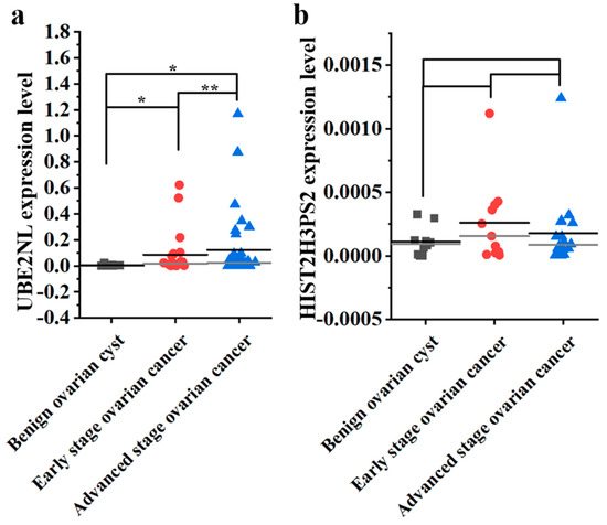Distribution of UBE2NL and HIST2H3PS2 mRNA in ovarian tissues. The dot plot shows mRNA expression levels of (a) UBE2NL and (b) HIST2H3PS2 in benign ovarian cysts (n = 10), early-stage (n = 21), and advanced-stage ovarian cancer (n = 35). Mean ± SD expressed in values. The Student’s t-test determined the significance. * represents p < 0.05; ** represents p < 0.01.
