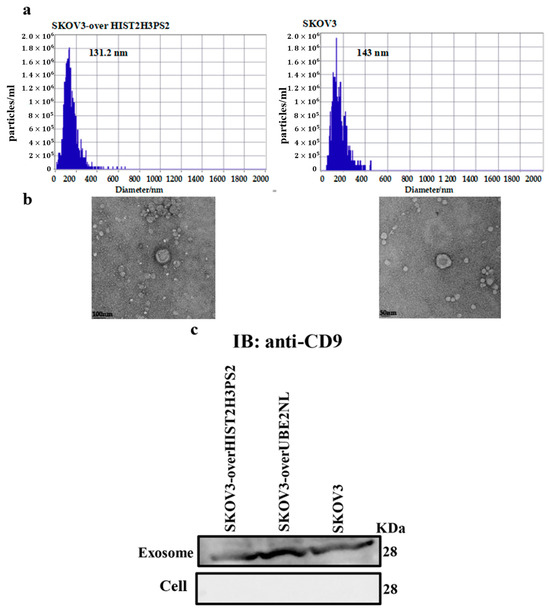 We verified the size and concentration of EXs using NTA. The average particle sizes of exosomes derived from SKOV3 and SKOV3-overexpressing HIST2H3PS2 (SKOV3/HIST2H3PS2) cells were 143.0 nm and 131.2 nm, respectively. The corresponding EX concentrations were 3.3 × 107 particles/mL and 9.5 × 107 particles/mL (Figure 4a).
