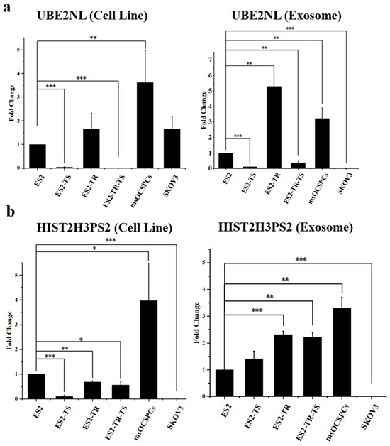 Differential expressions of UBE2NL and HIST2H3PS2 in EOC cells and their exosomes. UBE2NL (a) and HIST2H3PS2 (b) were detected in exosomes and cell lysates of more aggressive EOC cell lines, including ES2, ES2TR, spheres derived from ES2 cells (ES2TS), spheres derived from ES2TR cells (ES2TRTS), SKOV3, and msOCSPCs (MSC-OCSPCs), but were absent in exosomes derived from the less aggressive SKOV3 cells. * represents p < 0.05; ** represents p < 0.01; *** represents p < 0.001.