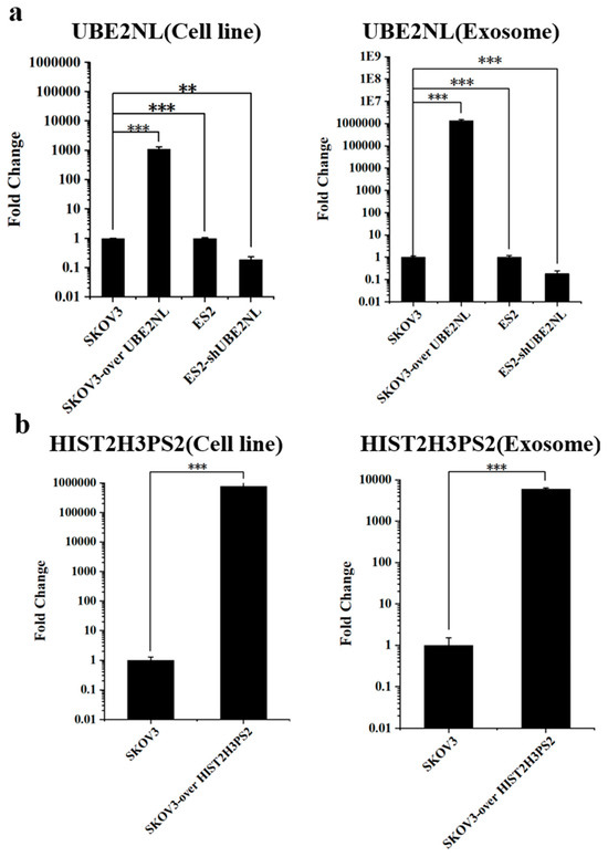 Expression of UBE2NL and HIST2H3PS2 in EOC cell lines and their derived exosomes. (a) Quantitative RT-PCR analysis showed that UBE2NL expression was higher in SKOV3/UBE2NL cells and their exosomes compared to SKOV3 controls; on the contrary, it was significantly reduced in ES2/shUBE2NL cells and their exosomes compared to wild-type ES2. (b) HIST2H3PS2 expression was also elevated in SKOV3/HIST2H3PS2 cells and their exosomes relative to SKOV3. ** represents p < 0.01; *** represents p < 0.001.