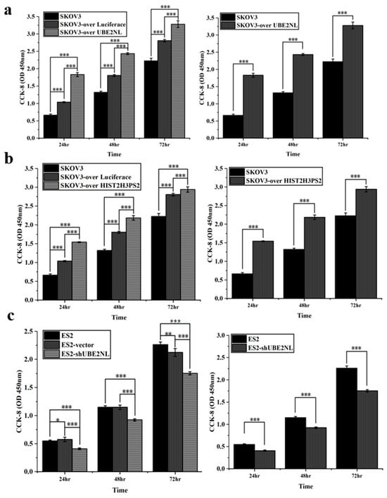 Cell viability analysis of EOC cells using CCK-8 assay. (a) SKOV3/UBE2NL cells exhibited significantly higher viability compared to wild-type SKOV3 cells. (b) Similarly, SKOV3/HIST2H3PS2 cells showed significantly increased viability relative to SKOV3 controls. (c) In contrast, ES2/shUBE2NL cells demonstrated significantly reduced viability compared to wild-type ES2 cells. * represents p < 0.05; ** represents p < 0.01; *** represents p < 0.001.