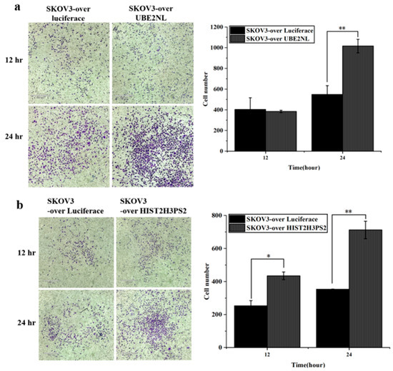 Invasion ability of SKOV3 cells overexpressing luciferase, UBE2NL, or HIST2H3PS2. Transwell invasion assays revealed that SKOV3 cells overexpressing (a) UBE2NL or (b) HIST2H3PS2 exhibited significantly greater invasive ability than SKOV3 cells overexpressing luciferase (control) at a microscope’s magnification of 100×. * represents p < 0.05; ** represents p < 0.01.