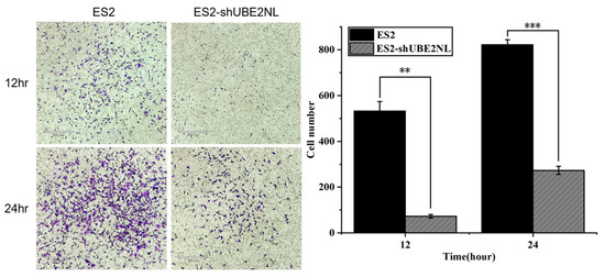 Invasion ability of ES2 and ES2/shUBE2NL cells. ES2/shUBE2NL cells exhibited significantly reduced invasion ability compared to wild-type ES2 cells, indicating that UBE2NL contributes to the invasive phenotype in EOC cells at a microscope’s magnification of 100×. ** represents p < 0.01; *** represents p < 0.001.