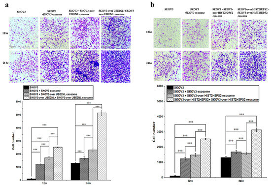Invasion ability of SKOV3 cells treated with UBE2NL- or HIST2H3PS2-enriched exosomes. (a) SKOV3 cells treated with SKOV3 EXs, SKOV3/UBE2NL EXs, or co-cultured with SKOV3/UBE2NL cells and their EXs showed significantly greater invasion ability than untreated SKOV3 cells at a microscope’s magnification of 100×. (b) Similarly, SKOV3 cells treated with SKOV3 EXs, SKOV3/HIST2H3PS2 EXs, or co-cultured with SKOV3/HIST2H3PS2 cells and their EXs exhibited significantly enhanced invasion compared to untreated SKOV3 cells at a microscope’s magnification of 100×. *** represents p < 0.001.