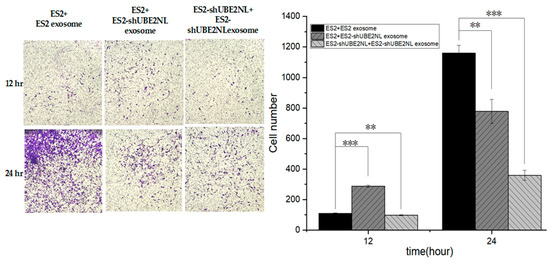 Invasion ability of ES2 cells treated with ES2 or ES2/shUBE2NL-derived exosomes. ES2 cells and ES2/shUBE2NL cells treated with EXs from ES2/shUBE2NL showed significantly decreased invasion compared to ES2 cells treated with EXs from wild-type ES2 cells at a microscope’s magnification of 100×. ** represents p < 0.01; *** represents p < 0.001.