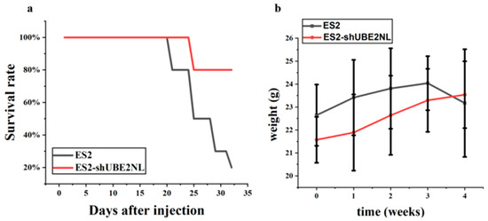 In vivo survival analysis of mice injected intraperitoneally with ES2 or ES2/shUBE2NL cells. (a) Kaplan–Meier survival curves show significantly improved survival in the ES2/shUBE2NL group compared to the ES2 group (p < 0.05, log-rank test). (b) No significant differences were observed in body weight before and after cell injection.