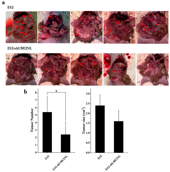 Disseminated tumors in the peritoneal cavity of mice. (a) Representative images and quantification of disseminated tumors in mice intraperitoneally injected with 1 × 106 cells. Red arrows indicate the location of tumor nodules. (b) Mice injected with ES2/shUBE2NL cells exhibited significantly fewer tumor nodules than those injected with ES2 cells. * represents p < 0.05.