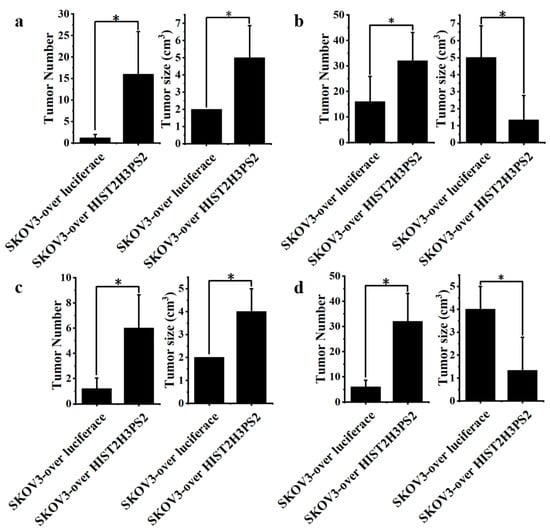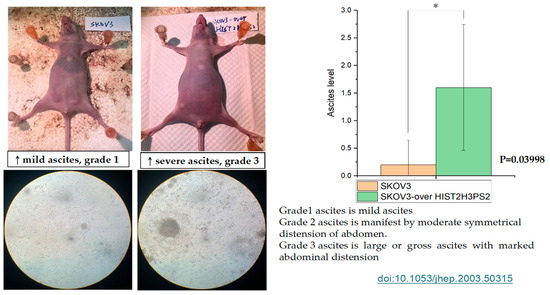 Severity of ascites formation in mice injected with SKOV3 or SKOV3/HIST2H3PS2 cells. Mice injected with SKOV3/HIST2H3PS2 cells developed significantly more severe ascites than those injected with SKOV3 cells. The bar chart shows the severity of ascites observed grossly and histologically at a microscope’s magnification of 40× in the peritoneal cavity of mice following intraperitoneal injection of 1 × 106 SKOV3 or SKOV3/HIST2H3PS2 cells [30]. * represents p < 0.05.